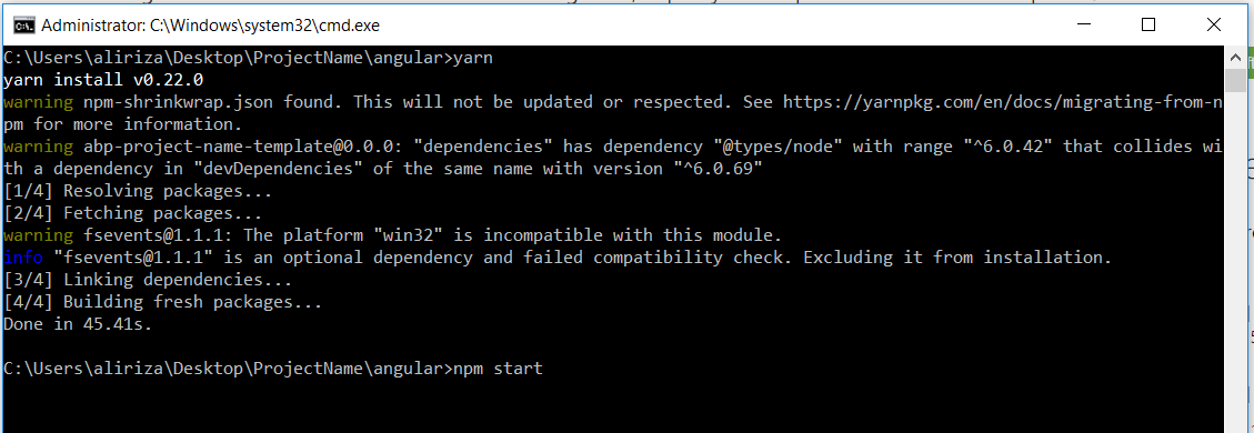 While host is already running and we can run Angular project that uses APIs. To run Angular project, make sure you have node and npm installed on your machine.