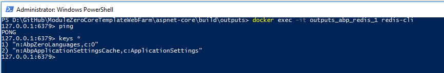 To understand if redis is working, you can use redis-cli. run docker exec -it outputs_abp_redis_1 redis-cli command to run redis-cli interactive mode to connect redis server that is running on docker container. Then to test if redis is running, write ping command and it will return PONG if it works. Now when I write keys * command, I should get the application cache keys.